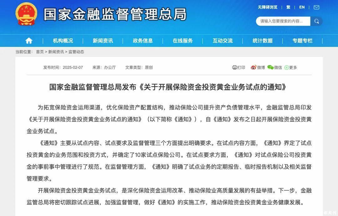 国家金融监督管理总局7日发布消息,为拓宽保险资金运用渠道,优化保险资产配置结构,推动保险公司提升资产负债管理水平,开展保险资金投资黄金业务试点。
