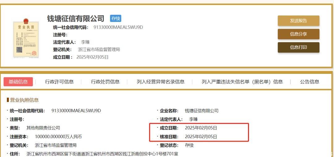 据国家企业信用信息公示系统显示,2月5日,钱塘征信有限公司(以下称“钱塘征信”)完成工商登记,作为继百行征信和朴道征信后的第三家持牌个人征信机构,钱塘征信正式成立。这将进一步优化征信市场布局,增加个人征信有效供给。